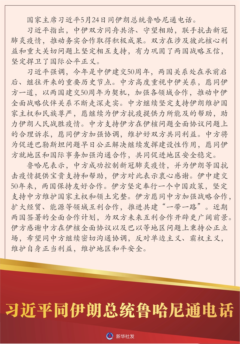?? 新華社北京5月24日電 國家主席習(xí)近平5月24日同伊朗總統(tǒng)魯哈尼通電話。