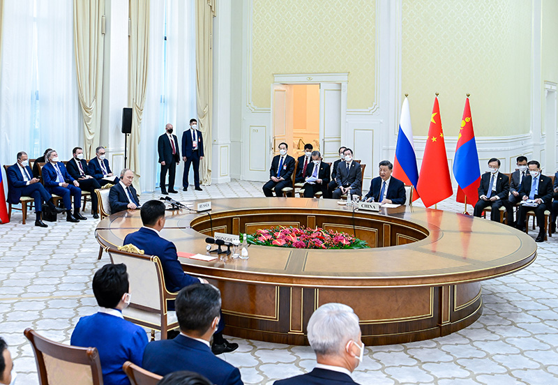 當(dāng)?shù)貢r間9月15日下午,國家主席習(xí)近平在撒馬爾罕國賓館同俄羅斯總統(tǒng)普京、蒙古國總統(tǒng)呼日勒蘇赫舉行中俄蒙三國元首第六次會晤。新華社記者 翟健嵐 攝
